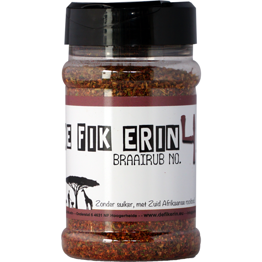 De Fik Erin Braairub no.4 Met als hoofdingrediënten Zuid-Afrikaanse Rooibos en Sumac is deze smaakexplosie van kruiden weer een hele mooie Braairub om aan het assortiment toe te voegen! Braairub no.4 bevat geen suiker en is daarom ook zeer geschikt voor directe bereidingen en bij open vuur!