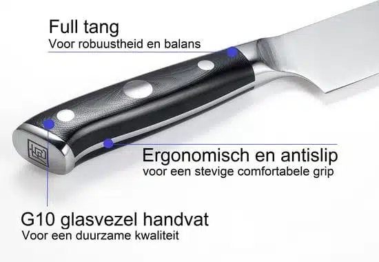De gesmede constructie gaat naadloos over van het mes naar het drievoudig geklonken handvat voor duurzaamheid en balans. Ook na langdurig gebruik van het mes zult u geen last hebben van een vermoeide pols.
