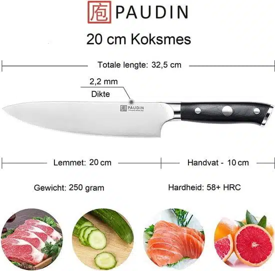Een goed koksmes koopt u niet voor even, maar moet jaren meegaan en in alle situaties soelaas bieden. Paudin staat voor kwaliteit en duurzaamheid, louter de beste staalsoorten worden gebruikt en de afwerking is altijd van het hoogste niveau. Een PAUDIN mes is vlijmscherp, elegant en heeft een veilige, ergonomische en comfortabele grip. Dit alles zorgt ervoor dat dit koksmes zich binnen zijn segment kan scharen onder de sterkste en beste messen in de markt! Kortom, PAUDIN keukenmessen zijn de messen waar u naar zoekt!
