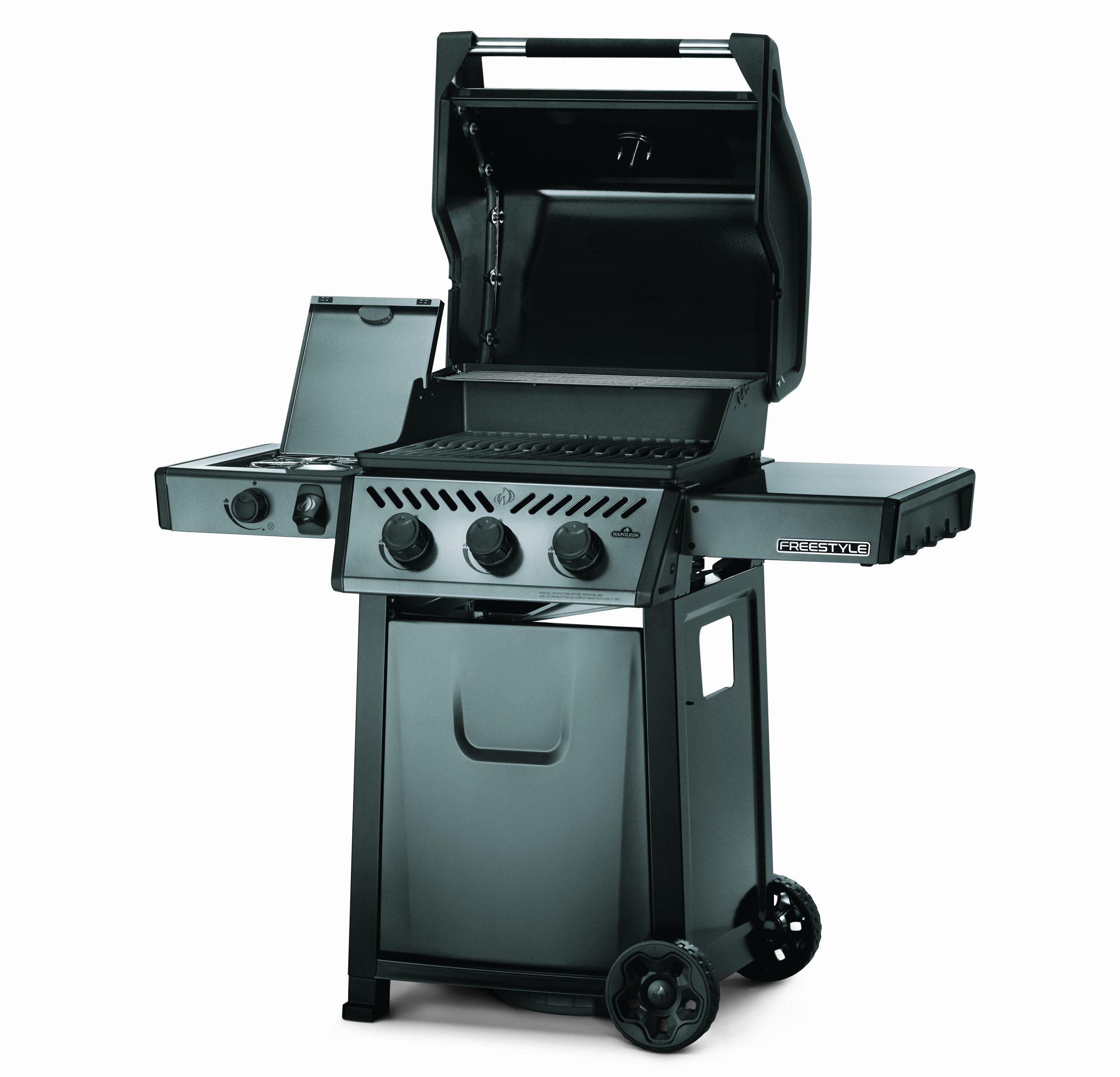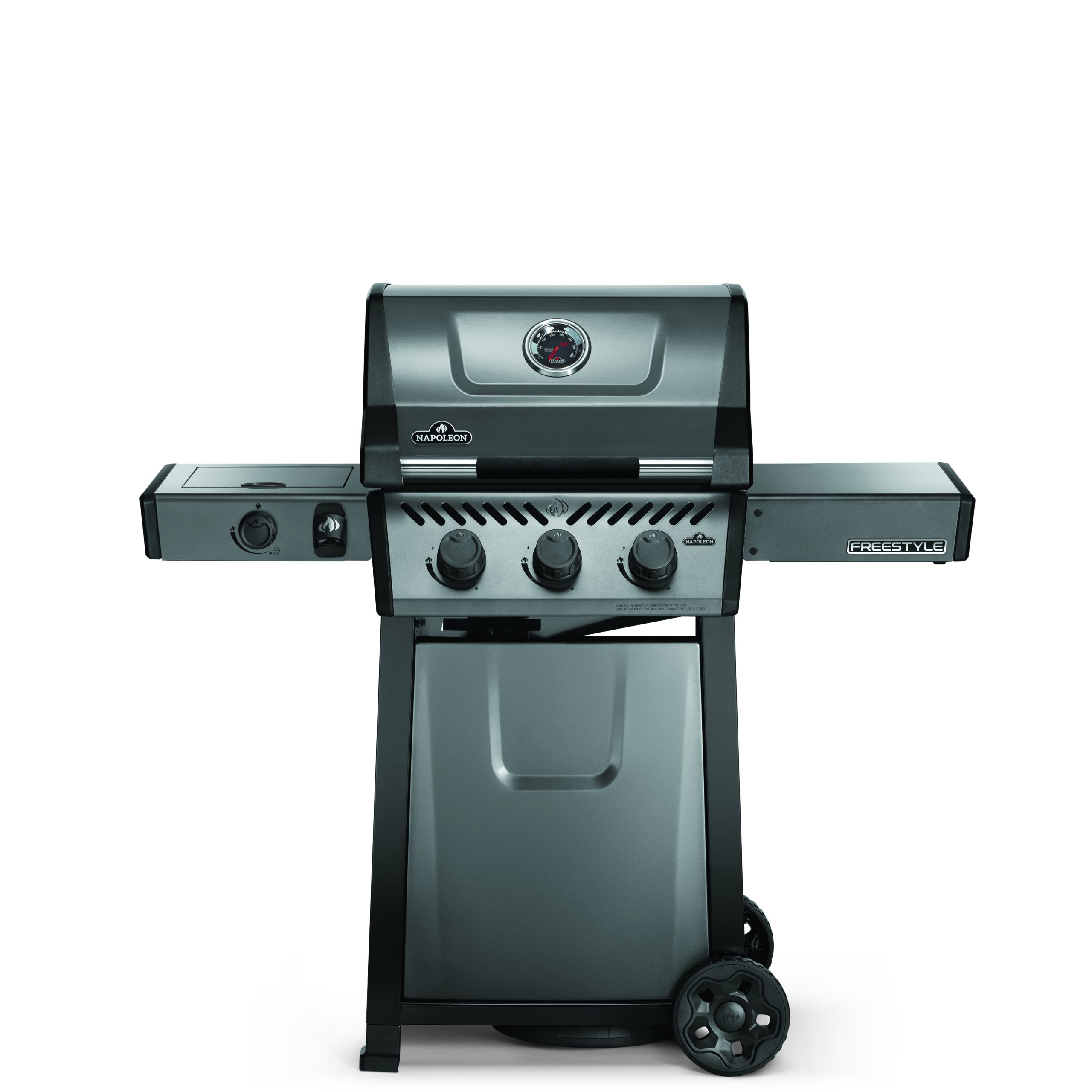 De Freestyle 365 propaangasbarbecue met aparte zijbrander is een compacte grill met premium functies en een onklopbare prijs. Met betrouwbare JETFIRE-ontsteking waarmee de hoofdbranders probleemloos met een eigen, krachtige ontstekingsvlam worden aangestoken. Schroei het vlees perfect dicht boven de gietijzeren grillroosters met porseleincoating. Drie RVS branders bieden gelijkmatige warmte die eenvoudig geregeld kan worden en gecontroleerd met de ingebouwde thermometer. Bereid bijgerechten tijdens het grillen met de aparte zijbrander Dankzij de robuuste wielen kan deze barbecue overal naartoe worden gereden, waar hij maar nodig is, terwijl de eenvoudig inklapbare zijtafels met gereedschapshouders en flessenopener ervoor zorgen dat de Freestyle bij uw levensstijl en ruimte past.