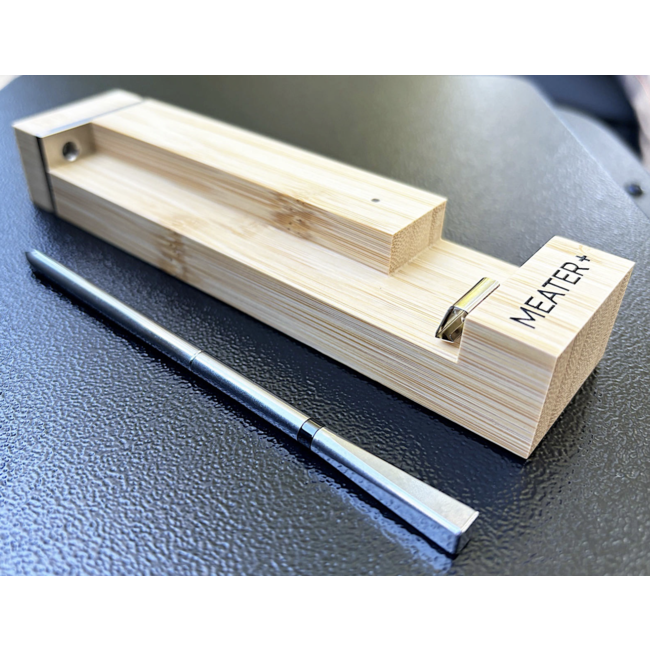 De Meater 2 Plus wordt geleverd in een kleine houten houder die fungeert als basisstation en oplader voor de probe. Het is een mooi design met een kleine behuizing (157 x 23 x 37 mm) en past dus prima op je keukenblad, in een la, buitenkeuken of aan je koelkast of op een ander koel metalen oppervlak dankzij de magneetjes aan de achterkant.