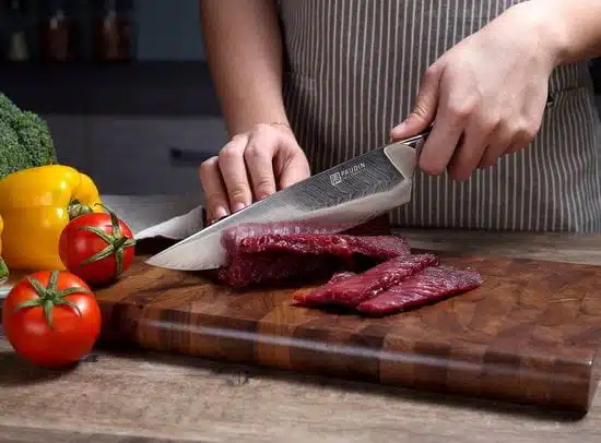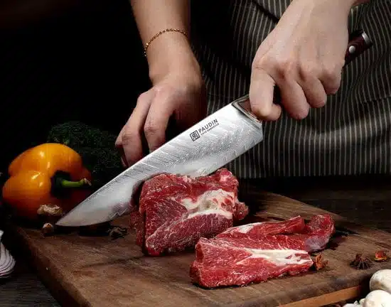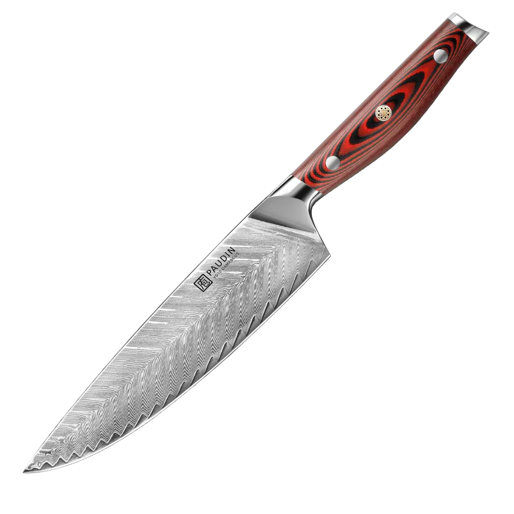 Dit PAUDIN koksmes is vervaardigd uit gesmeed damaststaal met een “veder” patroon. Tussen de 32 lagen damaststaal per zijde bevindt zich een kern van VG-10, waarmee je daadwerkelijk snijdt. Dit staal is, zeker voor rvs-begrippen, erg hard en kan vlijmscherp worden geslepen.