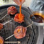 - Als het buikspek de 90 graden kerntemperatuur heeft gehaald, smeer je de lollies in met de bbqsaus.