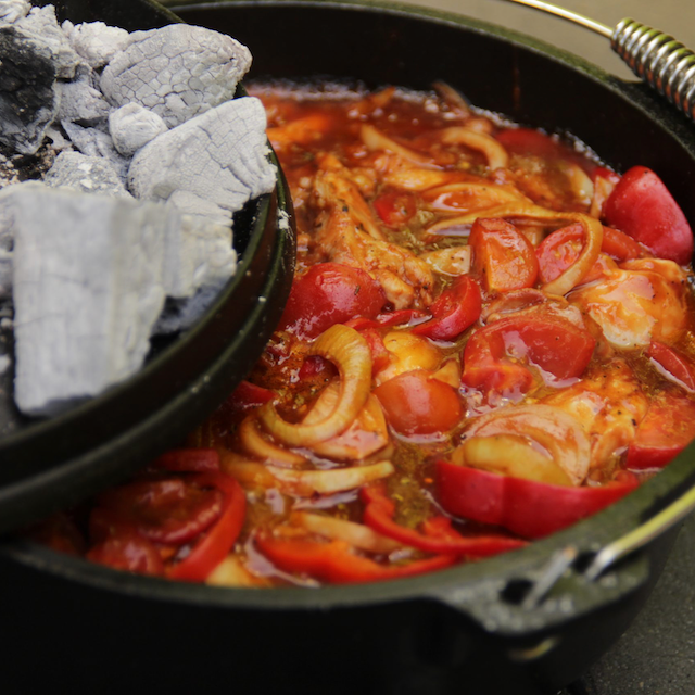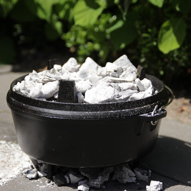 • Haal met een barbecue tang wat hete kolen uit de barbecue en leg deze op het deksel van de Dutch oven.