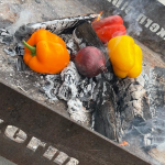 • Leg de rode uien en de paprika’s tussen de hete kolen. Laat ze zwart blakeren, tussendoor een paar keer omdraaien ( de paprika ong. 10 minuten en de uien ong. 30 minuten.).