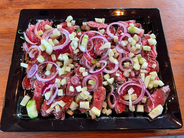 • Snij de longhaas in dunne plakken en bestrooi hem met peper en zout en serveer met de salsa.