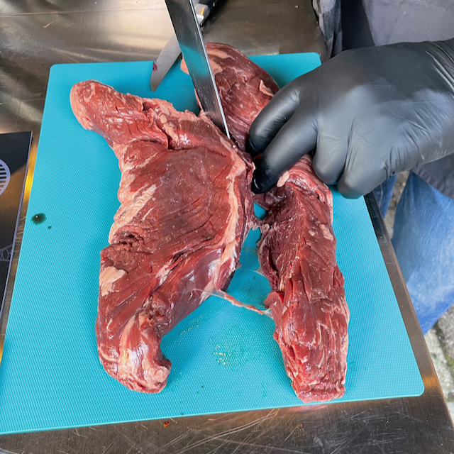 Het is noodzakelijk om deze eerst eruit te snijden, deze kan je niet eten. Je kan ook de slager vragen om dit alvast voor je te doen.