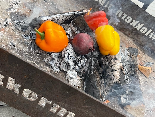 • Leg de rode uien en de paprika’s tussen de hete kolen. Laat ze zwart blakeren, tussendoor een paar keer omdraaien ( de paprika ong. 10 minuten en de uien ong. 30 minuten.).