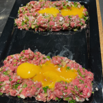 • Heb je een mooie steak tartare op ieder bord? Dan kun je de gerechten nog verder afmaken met een eidooier bovenop (maak dan een kuiltje in de steak tartare) en nog wat bieslook, peterselie en kappertjes.