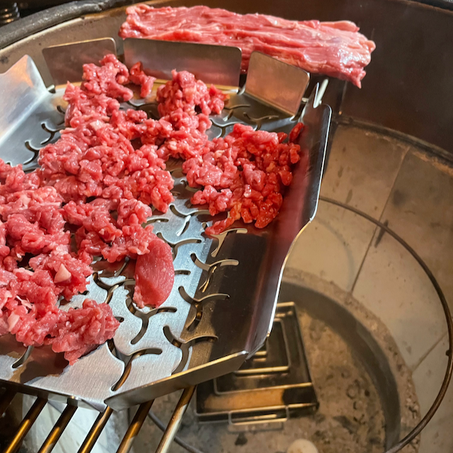 • Leg nu de bak met de gehakte bavette op het BBQ rooster en sluit de BBQ met de deksel. Zorg er voor dat de schuiven van je BBQ wel een beetje open staan, zodat de rookmot blijft branden en de rook mooi kan circuleren.