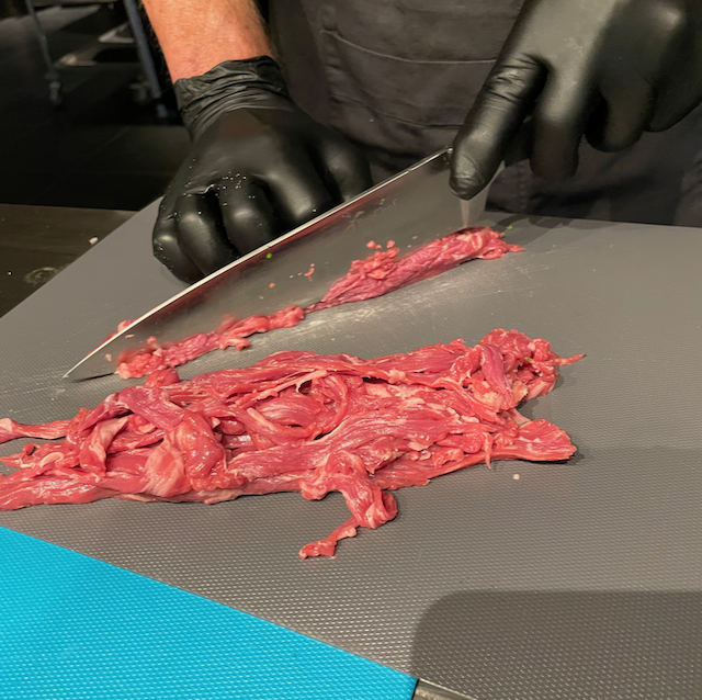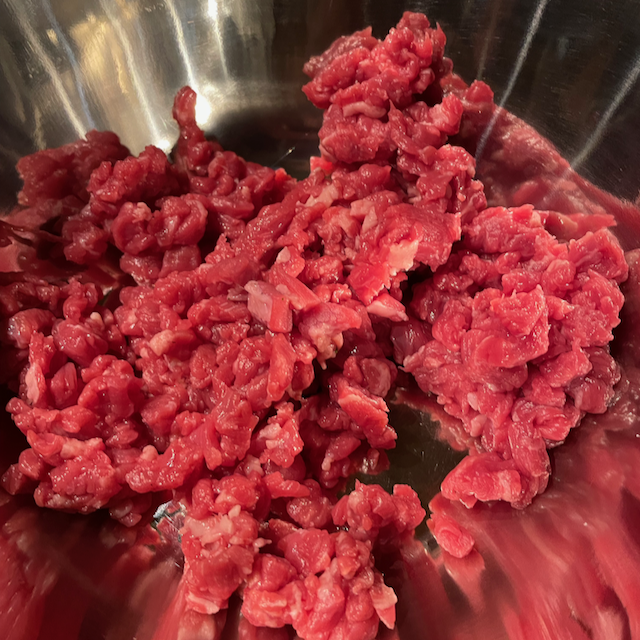 • Snijd het vlees vervolgens eerst in dunne repen en die repen daarna in kleine blokjes. Hak het vlees daarna nog goed door tot je eigenlijk een soort gehakt (daar komt de naam gehakt dus ook vandaan) hebt.